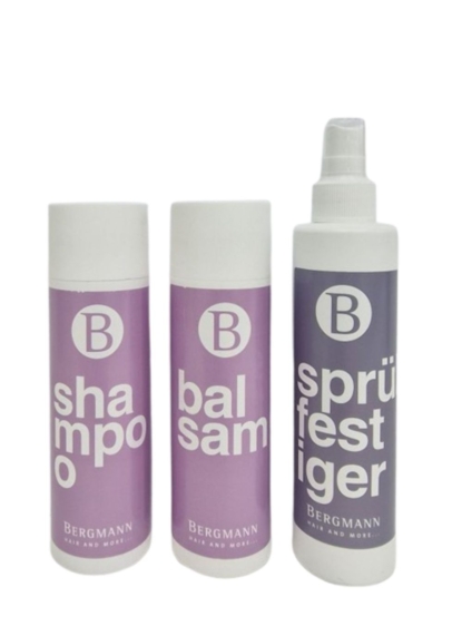 Mit diesem 3-teiligen Set erhalten Sie alles, was Sie für eine optimale Pflege für Ihr Zweithaar aus feinem Kunst- bzw. Synthetikhaar benötigen. Das Pflegeset sorgt dafür, dass strapaziertes Haar sorgsam repariert wird und lange eine wunderschöne Geschmeidigkeit und intensive Farben erhalten werden! Enthalten sind jeweils 200 ml sanftes Reinigungsshampoo, ein schützender Pflegebalsam, sowie ein speziell zum Frisieren von Kunsthaar entwickelter Sprühfestiger. Geben Sie das Shampoo einfach in ein lauwarmes Reinigungsbad und lassen Sie Ihr Zweithaar etwa 10-15 Minuten darin einwirken, die selbstreinigende Wirkung entfernt sämtlichen Schmutz und alle Rückstände aus den Haaren und der Montur. Auch den pflegenden Balsam vermengen Sie mit Wasser und lassen die Perücke oder das Haarteil darin einwirken. Lassen Sie Ihr Zweithaar anschließend trocknen und frisieren Sie es mit Hilfe des Sprühfestigers ganz einfach und unkompliziert nach Ihren Wünschen!