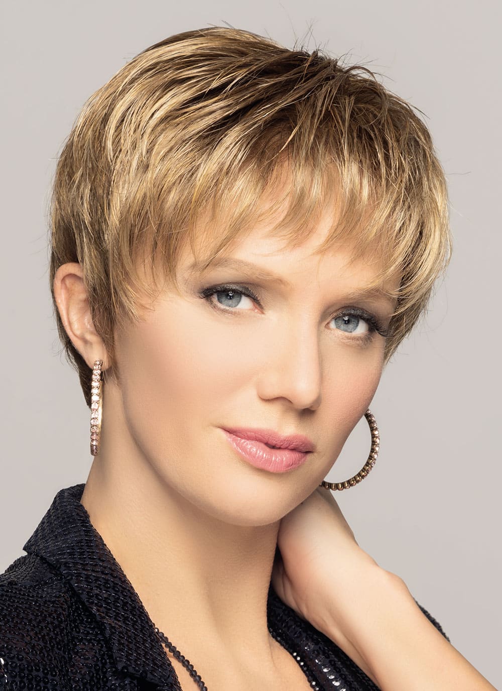 Sportlich schicker und kurzer Cut – die pfiffige Kunsthaarperücke Lima Hi Mono punktet mit einem modernen, zeitlosen Schnitt. Dieses attraktive Ellen Wille-Modell aus der Raquel Welch-Kollektion erhalten Sie bei uns in der Standardgröße (54-56 cm). Die sorgfältige Verarbeitung hochwertiger Materialien bietet Ihnen einen hohen Tragekomfort und eine ausgesprochen natürliche Optik Ihres Zweithaares. Am gesamten Oberkopf wurde der Damenperücke ein Monofilament eingearbeitet, auf welches das Haar in aufwendiger Handarbeit geknüpft wurde. Dieses feine und transparente Gewebe lässt die eigene Kopfhaut durchscheinen, sodass ein authentischer Eindruck von echtem Haarwuchs entsteht. Zusätzlich ist der speziell eingearbeitete Filmansatz im Stirnbereich einem echten Haaransatz nachempfunden. Die weichen, anschmiegsamen Tressen im unteren Bereich der Kunsthaarperücke erlauben eine angenehme Luftzirkulation und sicheren Halt. Für einen zusätzlichen, optimalen Sitz und individuelle Anpassung Ihres Zweithaares an Ihren Kopfumfang sind elastische Baumwollbänder am Hinterkopf eingearbeitet. Genießen Sie ein erfrischend leichtes Tragegefühl und den besonders natürlichen Look dieser Montur, ohne auf perfektes Styling verzichten zu müssen. Dem feinen, pflegeleichten Kunsthaar wurde seine trendy Kurzhaarfrisur bereits während der Herstellung eingearbeitet. Dadurch fallen die Haare nach dem unkomplizierten Waschen und schnellen Trocknen auf einem Perückenständer direkt wieder in ihre Form zurück. So ist die Ellen Wille-Perücke immer top frisiert und ready-to-wear, damit Sie sich um Ihr Styling keine Gedanken machen brauchen. Um die Geschmeidigkeit und die Brillanz der Haarfarbe zu erhalten, empfehlen wir Ihnen spezielle Shampoos und Pflegeprodukte für Kunsthaar aus unserem Onlineshop. Sie suchen nach einer unkomplizierten und attraktiven Perücke mit natürlicher Optik? Dann ist das Modell Lima Hi Mono aus der Raquel Welch-Kollektion genau das Richtige für Sie!