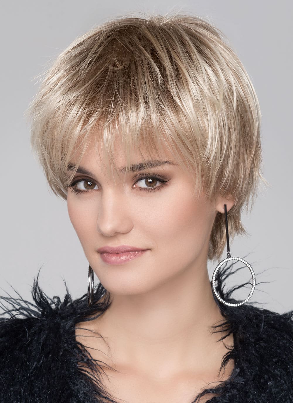 Frecher Fransen-Look mit aufregend durchgestuftem Cut – erleben Sie die moderne Kunsthaarperücke Start von Ellen Wille und erfreuen Sie sich an ihrer natürlichen Optik und einem angenehmen Tragekomfort! Der fransige Pony fällt lässig ins Gesicht und verdeckt so gekonnt den Rand der Damenperücke. Außerdem besitzt dieses Modell aus der Hairpower-Kollektion ein schönes Volumen und einen lebendigen Schwung, wodurch Ihr Zweithaar besonders natürlich wirkt. Diese Ellen Wille-Perücke erhalten Sie in der Standardgröße (54-56 cm). Der untere Bereich der Montur besteht aus einem atmungsaktiven und elastischen Tressen-Gewebe, das sich sanft an Ihren Kopf schmiegt. Außerdem lässt sich die Perücke für einen zusätzlich sicheren Halt mithilfe eingearbeiteter Baumwollbänder individuell an Ihren Kopfumfang anpassen – für ein rundum sorgloses Tragegefühl. Im Bereich des Scheitels bzw. Wirbels wird ein besonders natürlicher Look erzielt, da dort ein transparenter, per Hand geknüpfter Filament-Stoff einen Blick auf die menschliche Kopfhaut erlaubt.