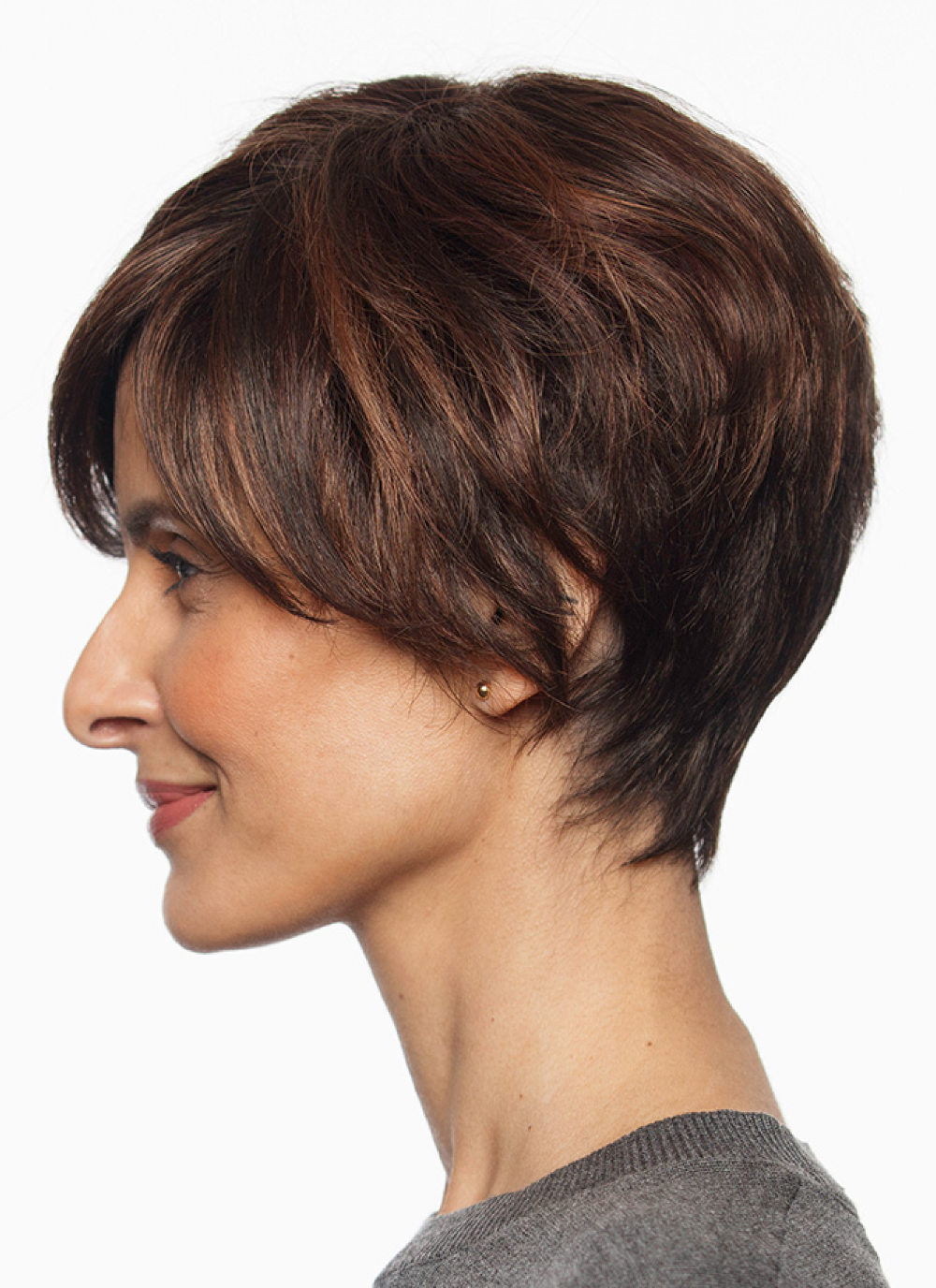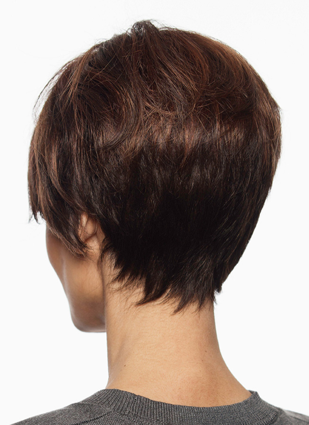 Mit diesem auffallenden und absolut modernen Look von Fancy Hair gelingt Ihnen ein stilvolles Auftreten mit Leichtigkeit! Die Kunsthaarperücke Kinu aus der Kollektion Sentoo besitzt einen außergewöhnlichen Schnitt, der neben dem schrägen, langgezogenen Pony eine lange, anliegende Nackenpartie aufweist und der über den Ohren gleichzeitig etwas kürzer gehalten ist! Als Gerüst weist die stylische Damenperücke eine Kombination aus Tressen und einem Monofilamentgewebe auf, was ein Indiz für die besondere Qualität dieses Modells ist! Die Tressen sind atmungsaktiv und erzeugen einen angenehmen Tragekomfort, während das Monofilament die menschliche Kopfhaut durchscheinen lässt und damit für verblüffende Authentizität sorgt! Zu erwähnen ist darüber hinaus der Filmansatz im Bereich der Stirn, der den Rand der Perückenmontur gekonnt kaschiert! Wie Sie sehen, handelt es sich bei der edlen Kurzhaarperücke Kinu um ein erstklassiges Modell von Fancy Hair, das Sie sich nicht entgehen lassen sollten!