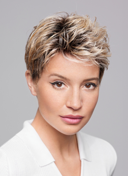 Die Kunsthaarperücke Spica aus der WELLNESS Galaxy Collection von GFH ist ein luxuriöses Modell, das Eleganz, Natürlichkeit und höchsten Tragekomfort verbindet. Sie ist perfekt für Frauen, die sich eine handgeknüpfte Perücke mit maximaler Authentizität wünschen. Gefertigt aus hochwertiger High Heat Fiber, ist die kurze Damenperücke Spica bis 130 °C hitzebeständig und erlaubt grenzenloses Styling. Glätten, Locken oder sanftes Föhnen – die Frisur bleibt formstabil, lässt sich aber dennoch immer wieder neu gestalten. Damit bietet Spica Flexibilität und Pflegeleichtigkeit in einem.Die Montur ist besonders hochwertig: ein transparentes Mono-Top in Kombination mit einem Lace Front sorgt für eine natürlich wirkende Haarlinie und ein realistisches Gesamtbild. Zudem ist die Perücke zu 100 % handgeknüpft, was sie außergewöhnlich komfortabel und authentisch macht. Ein samtiges Nackenteil, Stretchmaterialien und ein elastischer Gummizug sorgen zusätzlich für sicheren Halt und hohen Tragekomfort. Die Kopfgröße beträgt 53–55 cm. Optisch zeigt sich Spica mit einem modernen, eleganten Schnitt, der Weiblichkeit und Natürlichkeit unterstreicht. Dank der breiten Farbpalette lässt sich das Modell individuell anpassen und bietet zahlreiche Stylingmöglichkeiten. Die GFH-Perücke Spica ist ein exklusives Modell für Frauen, die Wert auf Qualität, Natürlichkeit und unbegrenzte Stylingfreiheit legen.