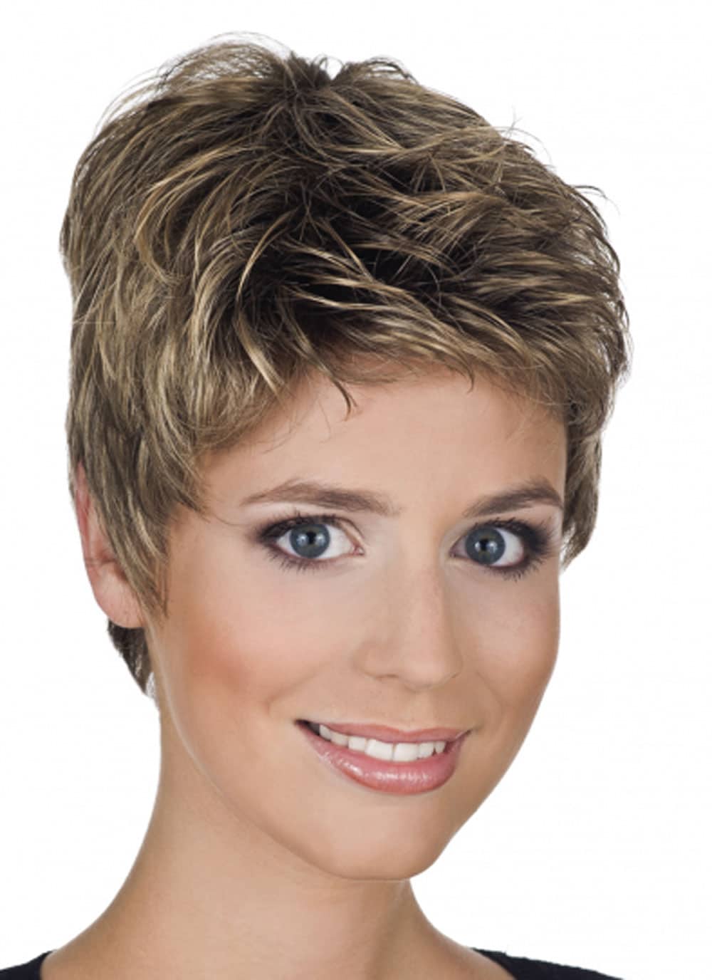 Eleganter Kurzhaarschnitt, der gleichzeitig sportlich und sehr feminin wirkt – mit der dynamischen Kunsthaarperücke Grazielle Lace Small klein von Gisela Mayer erhalten Sie eine unkomplizierte und trendy Kurzhaarfrisur! Dieses Modell ist Teil der Small & Large Collection und für eher zierliche Frauenköpfe mit einem Kopfumfang bis zu 53 cm geeignet. Im Scheitel- und Wirbelbereich ist ein handgeknüpfter Monofilament-Teil eingearbeitet, welcher wie eine natürliche Kopfhaut aussieht. So erhalten Sie ein ausgesprochen natürliches Aussehen, da es an dieser Stelle so aussieht, als würden die Haare echt aus dem Kopf wachsen! Im Stirnbereich wird der Rand der Damenperücke durch den innovativen Filmansatz gekonnt versteckt. Im unteren Bereich der Montur wurden weiche Tressen zu einem elastischen Gewebe zusammengenäht. Diese atmungsaktiven Baumwollbänder bieten Ihnen einen sicheren Halt Ihres Zweithaares und verleihen der Gisela Mayer-Perücke den hohen Tragekomfort.